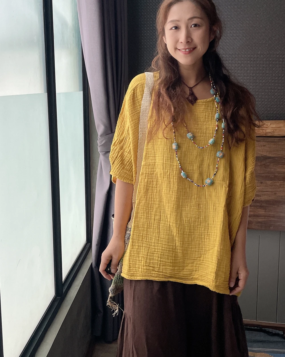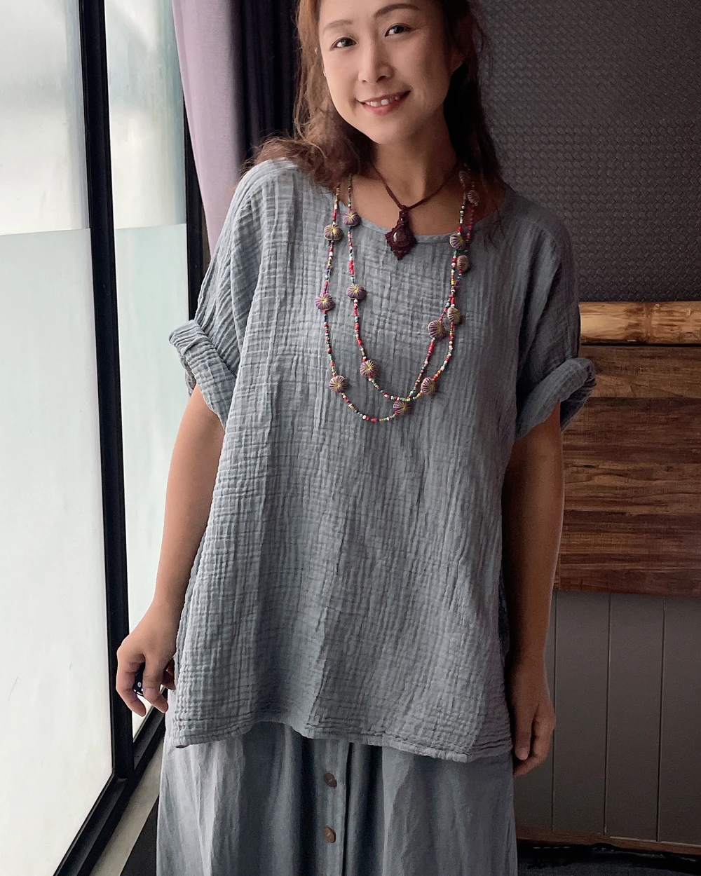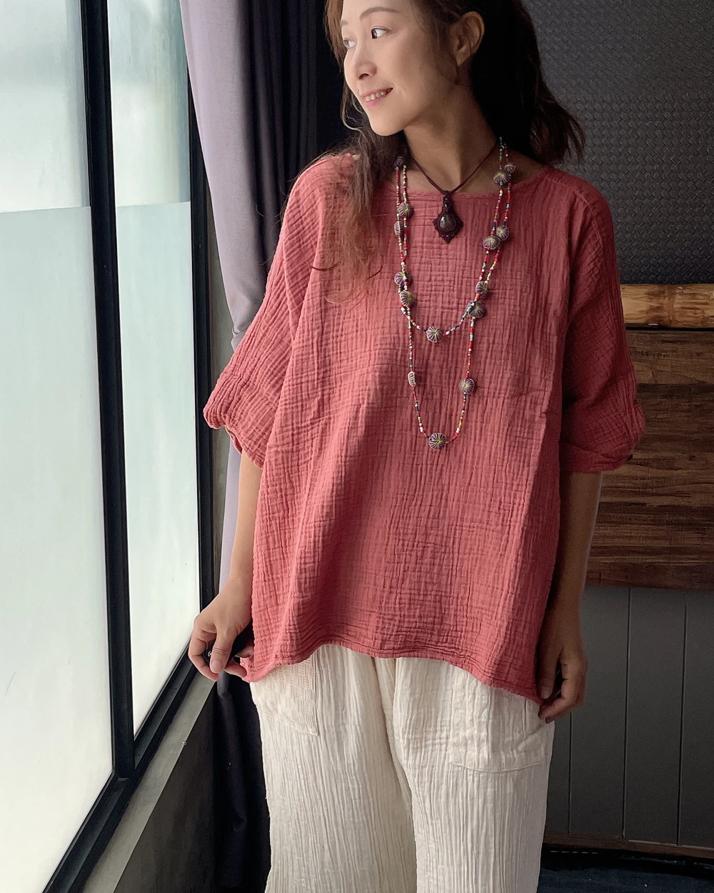 M919雙層棉紗七分袖木釦上衣